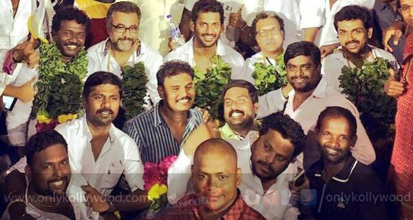 Pandavar Ani, comprising Vishal, Nassar, Karthi, Ponvannan and Karunas, has accomplished a decisive victory in the just concluded Nadigar Sangam elections. The incumbent team, headed by Sarathkumar and Radharavi, lost all the five important posts including President, Vice President (two posts), Treasurer and General Secretary.